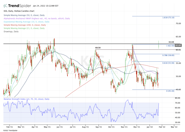 On the downside, I would be somewhat skeptical of Kohl’s stock if it loses the $60 to $60.50 area. Below the 78.6% retracement of the current range (at $58.83) and the stock could start to move lower.