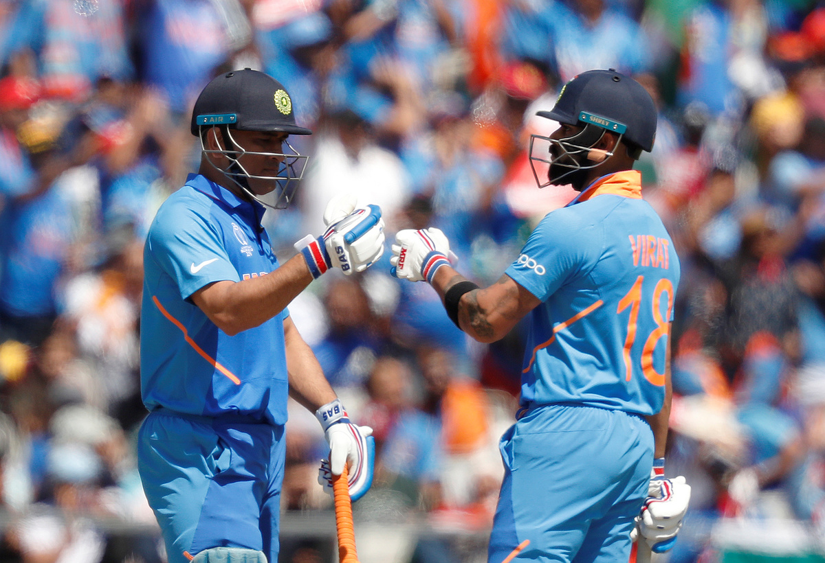 Opting to bat first, India's middle order did not exactly cover themselves in glory but skipper Virat Kohli's elegant 72 and Mahendra Singh Dhoni's laboured 56 not out helped them to a competitive 268-7 at Old Trafford.