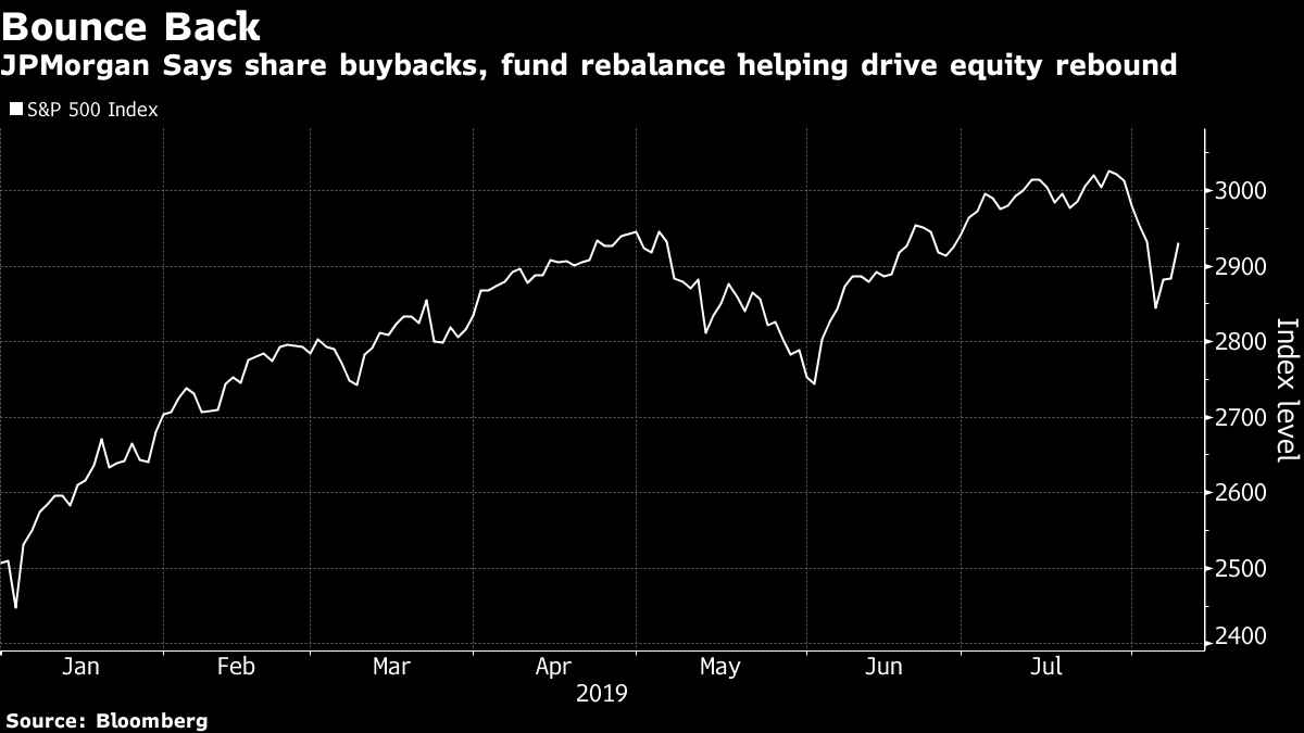 JPMorgan’s finding on corporate demand echoes that from Goldman Sachs Group Inc. David Kostin, Goldman’s chief U.S. equity strategist, told Bloomberg TV earlier that the firm’s buyback desk saw executions increase “dramatically” Monday when the S&P 500 tumbled 3%.