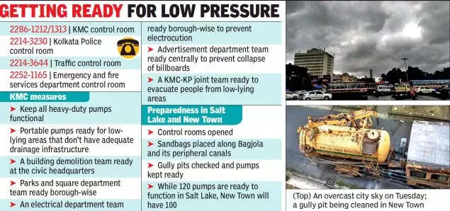 KMC geared up with a series of measures to counter the impact of a possible deluge. It has kept portable pumps ready to drain out water from low-lying areas off EM Bypass, Behala (parts), Joka, Garden Reach and parts of the Tollygunge-Jadavpur belt.