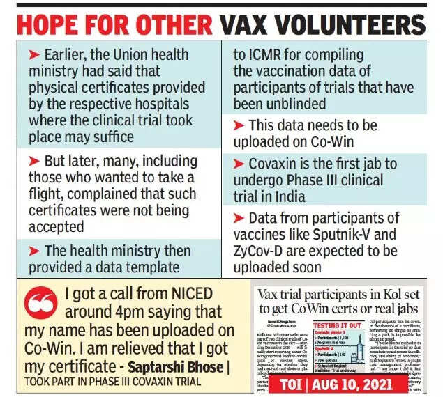 On August 10, TOI had reported about the anxiousness among vaccine trial participants who were yet to receive certificates, a document that has assumed much importance this pandemic for travel and entry to certain places.