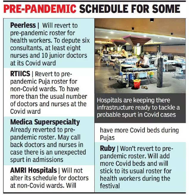 KOLKATA: Several private hospitals in Kolkata will be reverting to their pre-pandemic roster for doctors and nurses in non-Covid wards during the festive days next week. At Covid wards, however, presence of the existing strength of personnel will continue even as some have decided to extend their Covid units and be ready to deploy more health workers at a short notice in case there is a spurt.