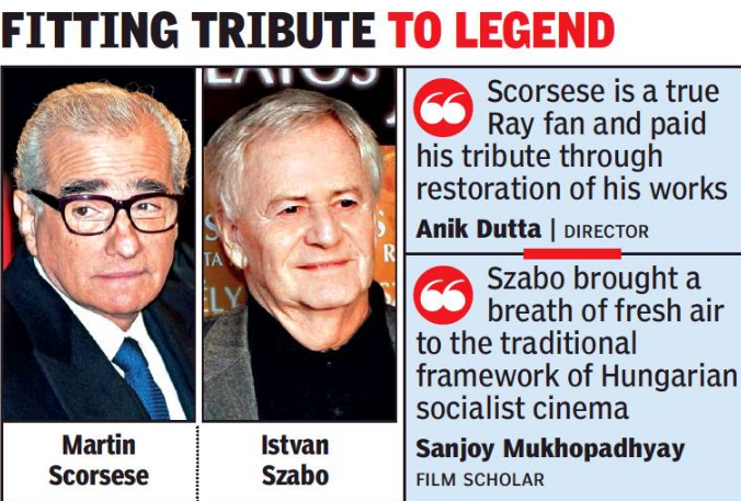 KOLKATA: Cine buffs in the city have welcomed Union minister for information and broadcasting Anurag Thakur’s announcement to confer the Satyajit Ray Lifetime Achievement Award on film-makers Istvan Szabo and Martin Scorsese at the 52nd International Film Festival of India (IFFI). According to the Ray family, this is a fitting tribute to the legend on his centenary year.