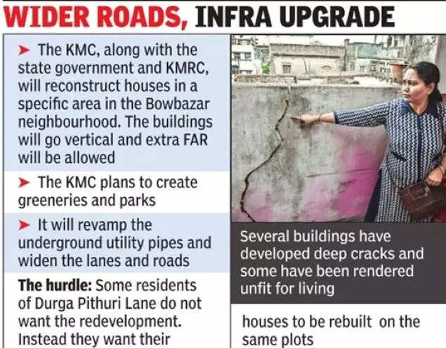 KOLKATA: The KMC is working on a rejuvenation and redevelopment plan for Durga Pithuri Lane and surroundings to facilitate a transformation of the adjoining neighbourhood, from a congested locality with century-old, dilapidated houses to a planned development with vertical houses and open spaces for greenery. Also, infrastructure, such as water and drainage pipelines, might be revamped. But the challenge for the civic body is to get all the residents on board.
