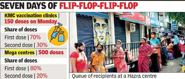 KMC’s schedule change on Monday was prompted by the rise in demand for the second dose. The civic authority had on Saturday decided to allocate 70% of vaccines for the first dose and decided to administer it between 10 am and 2 pm, followed by the second dose for the next two hours.