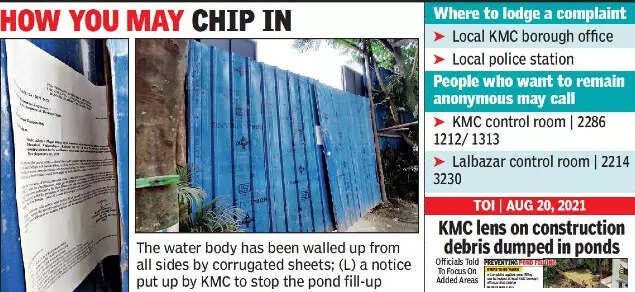 KOLKATA: KMC’s environment department on Monday stepped in to stop land sharks from filling up a pond in the Mukundapur locality. Civic officials who rushed to the spot after getting an anonymous tip-off lodged an FIR with Purba Jadavpur police and also put up a notice, warning stern action if any further attempt was made to fill up the water body.