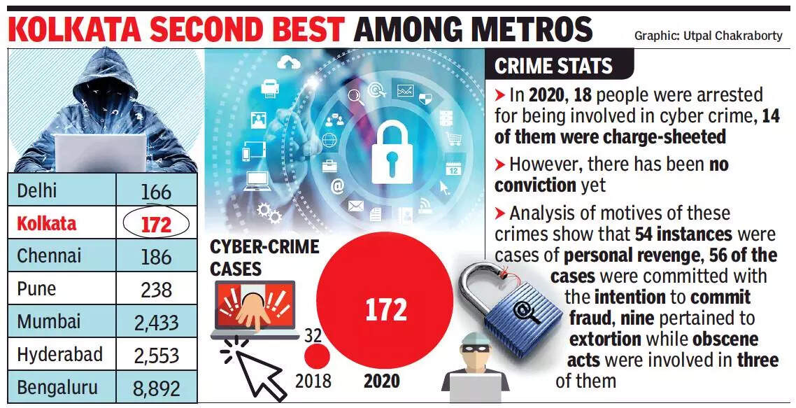 KOLKATA: A five-fold rise in cyber crime cases in Kolkata over two years reflects the increased online engagement of citizens in the post-pandemic scenario, felt cops. While 32 FIRs pertaining to cyber crime were registered in 2018, the number shot up to 172 in 2020. Though the spike in Kolkata is significant, the number is miniscule when compared to Bengaluru (8,892) and Hyderabad (2,553).