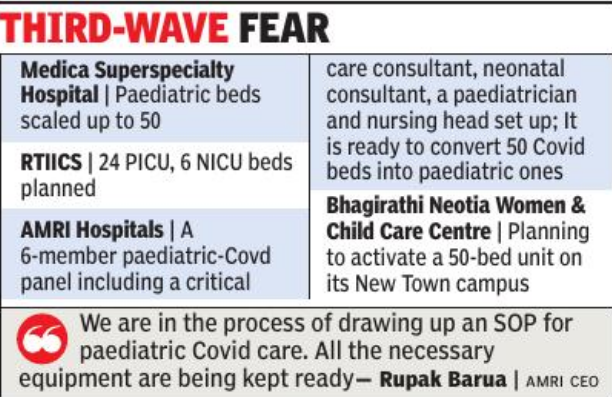 Medica Superspecialty Hospital has already trained a team of doctors and nurses to attend to paediatric Covid patients. “We have scaled up the number of paediatric beds to 50. If needed, we will convert more beds and integrate them into the ward,” said Medica chairperson Alok Roy.