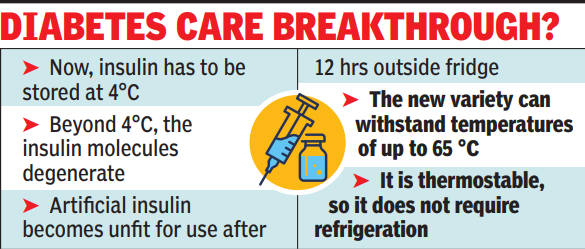 KOLKATA: A team of scientists, including two from the city, have managed to develop a “thermostable” variety of insulin, which eliminates the need to keep it refrigerated. The development is being seen as a breakthrough in scientific circles because, for years now, portability has been the biggest hurdle for insulin-dependent diabetics.