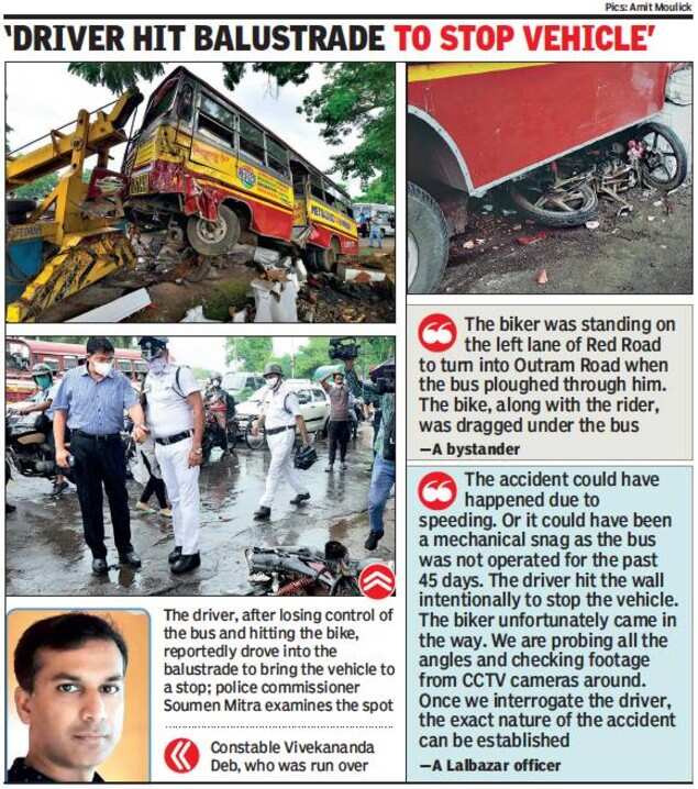 “The accident could have happened due to speeding. Or it could have been a mechanical snag as the bus was not operated for the past 45 days. The driver hit the wall intentionally to stop the vehicle. The biker unfortunately came in the way. We are probing all the angles and checking footage from CCTV cameras around. Once we interrogate the driver, the exact nature of the accident can be established,” said a Lalbazar officer.
