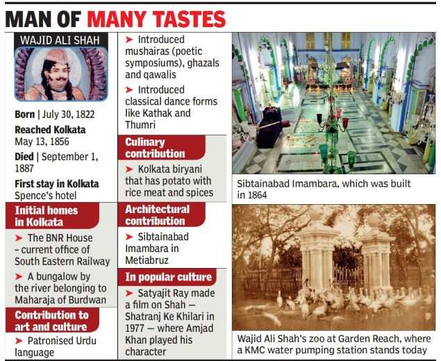 KOLKATA: Some 165 summers ago, a 34-year-old king from Awadh in Lucknow had docked his steamer at a Hooghly bank — now popular as Bichali Ghat in Metiabruz — and made the neighbourhood his home. The king was none other than one of the most celebrated characters in Bengali history — Wajid Ali Shah, the Nawab who made biryani affordable by making potato mandatory after a chef's experiment proved a hit.