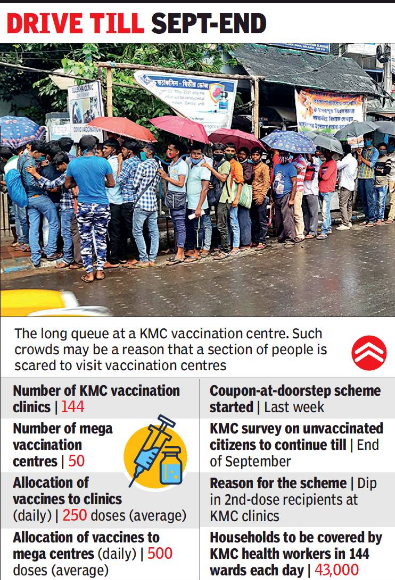 KOLKATA: The civic body has started sending health workers to households across the city with coupons that will ensure a vaccination slot without queueing up at civic vaccination centres. This door-to-door visit by health workers was launched last week and will continue till the end of this month, said a Kolkata Municipal Corporation (KMC) health department senior official.