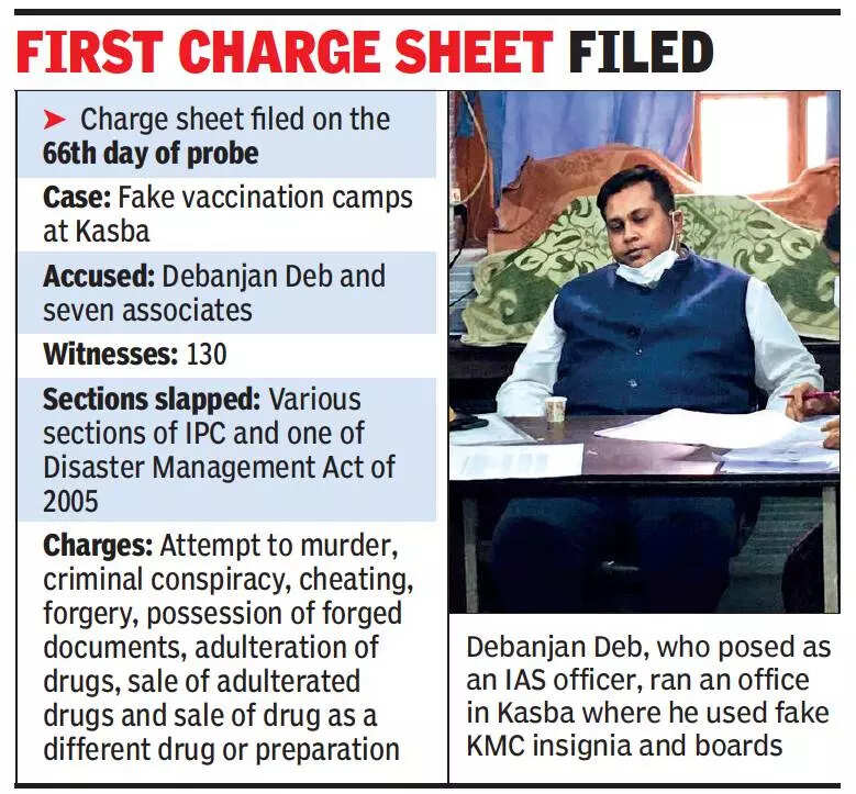 A little over two months after a special investigation team was formed with detective department officers to probe Deb and his seven associates’ roles in organizing fake Covid vaccination camps, the first charge sheet was submitted on Thursday. Deb and the others have been charged under 13 sections of the IPC and one of the Disaster Management Act for criminal conspiracy, cheating, forgery, possession of forged documents, adulteration of drugs, sale of adulterated drugs and sale of drug as a different one.