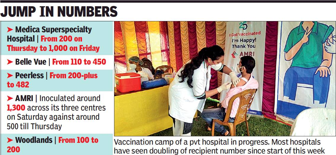 Peerless Hospital is among those which saw a sudden surge three days ago, when the number of recipients jumped from 200-plus to 482. “Those who got the first shot during the second wave are back. So, queues will now get longer. We expect the number to cross 600 in the next few days and are getting ready with enough stocks,” said Peerless CEO Sudipta Mitra.