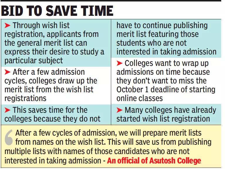 KOLKATA: Many colleges have decided to float something called a “wish list” where applicants from the general merit list can express their desire to take admission in a particular subject which will then help the colleges to prepare a merit list from the pool of names on the wish list.