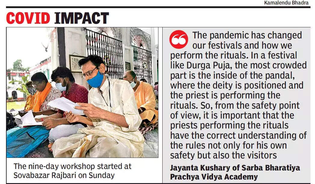 “The pandemic has changed our festivals and how we perform the rituals. In a festival like Durga Puja, the most crowded part is the inside of the pandal, where the deity is positioned and the priest is performing the rituals. So, from the safety point of view, it is important that the priests responsible for performing the rituals have the correct understanding of the safety guidelines not only for his own safety but also the visitors and to ensure that all the rituals are performed abiding by the rule book,” said Jayanta Kushary of Sarba Bharatiya Prachya Vidya Academy, a school of oriental studies.