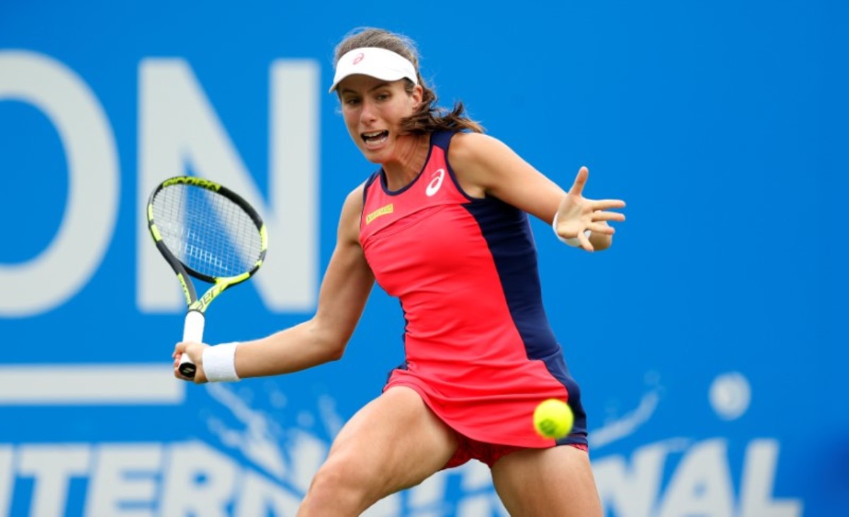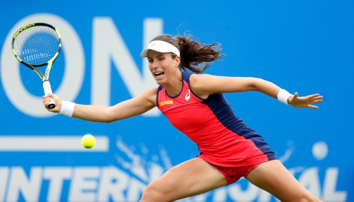 (Reuters) - Britain's Johanna Konta enjoyed an extraordinary day, beating French Open champion Jelena Ostapenko then overcoming a bad fall to defeat world number one Angelique Kerber and reach the semi-finals of the Aegon International at Eastbourne on Thursday.