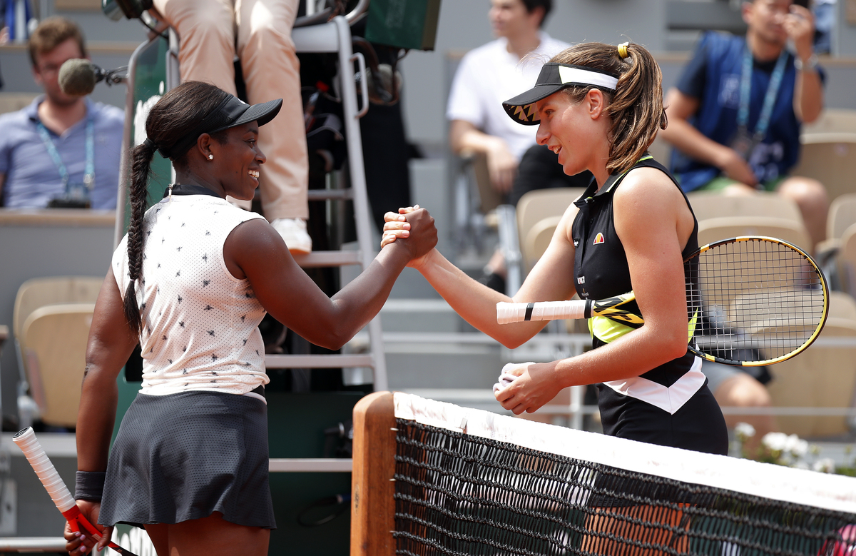 Tennis - French Open - Roland Garros, Paris, France - June 4, 2019. Britain's Johanna Konta and Sloane Stephens of the U.S. shake hands after the quarterfinal match. REUTERS/Kai Pfaffenbach