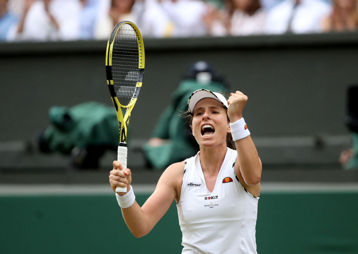 LONDON (Reuters) - Britain's Jo Konta staggered away from a head-on collision with twice champion Petra Kvitova at Wimbledon on Monday for a three-set victory which put her in the quarter-finals, and instantly installed her among the favourites for the title.