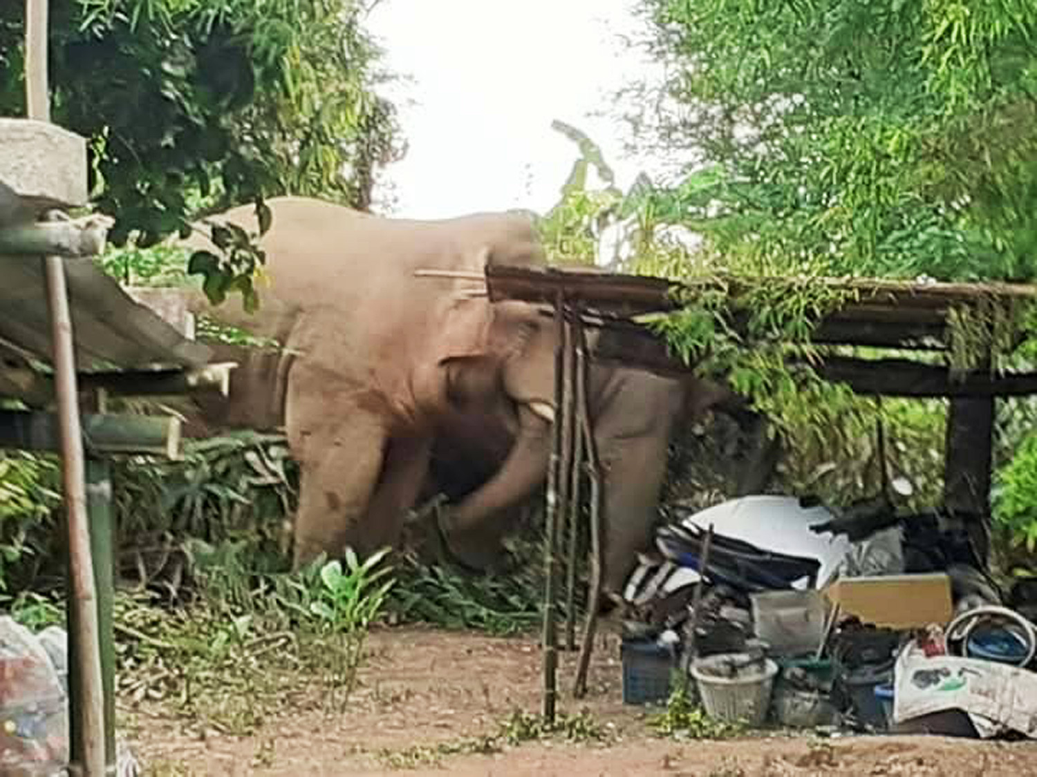 The poster said that early on Saturday night the two pachyderms stormed into Ban Tha Wang Sai in tambon Wang Mi of Wang Nam Khieo district. The villagers made loud noises in an attempt to scare them away, but to no avail. They went on to crush their houses, destroy their belongings and trampled on coconut, mango, banana and other trees in their plantations.