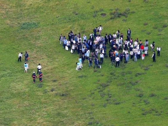 Crowds gathered next to the runway, which was shut, with all flights from the airport delayed.