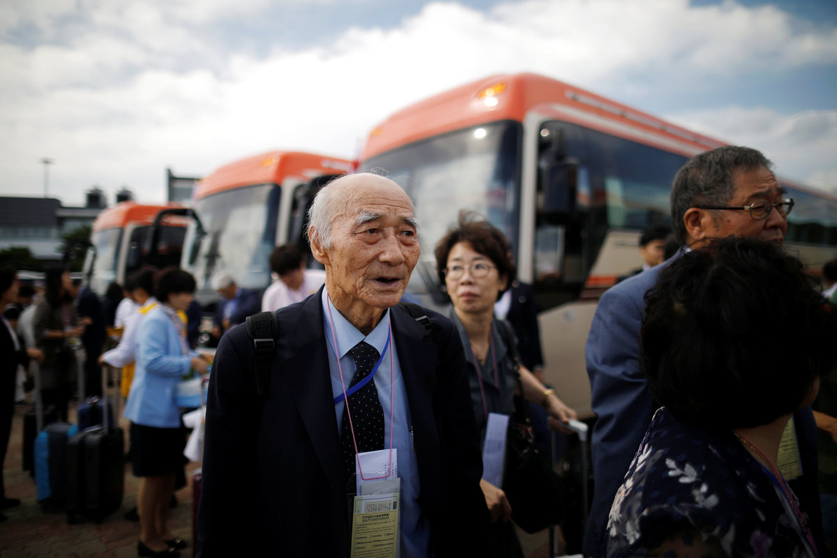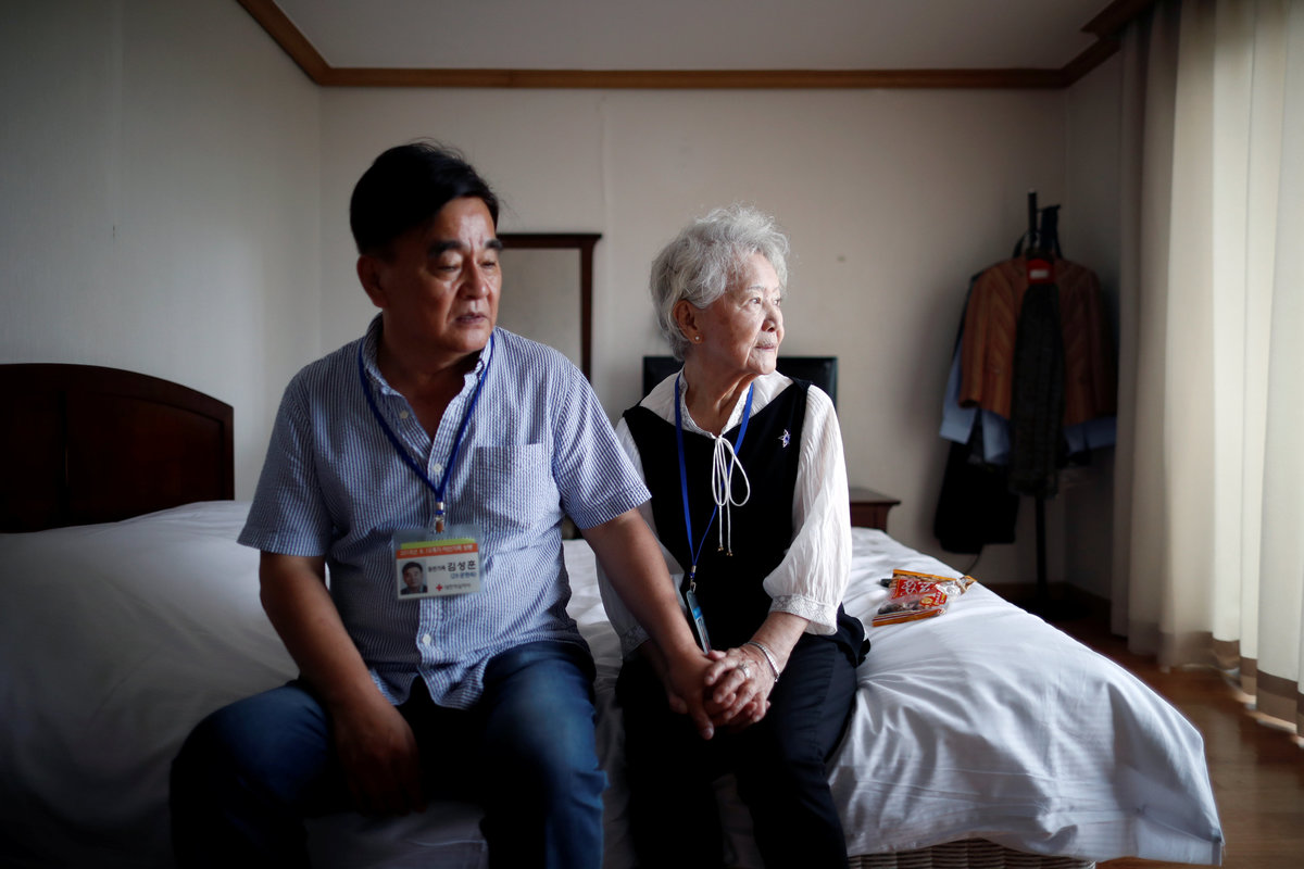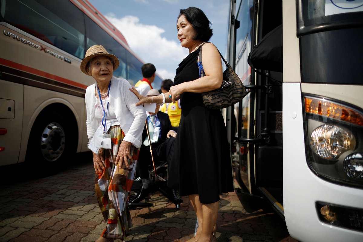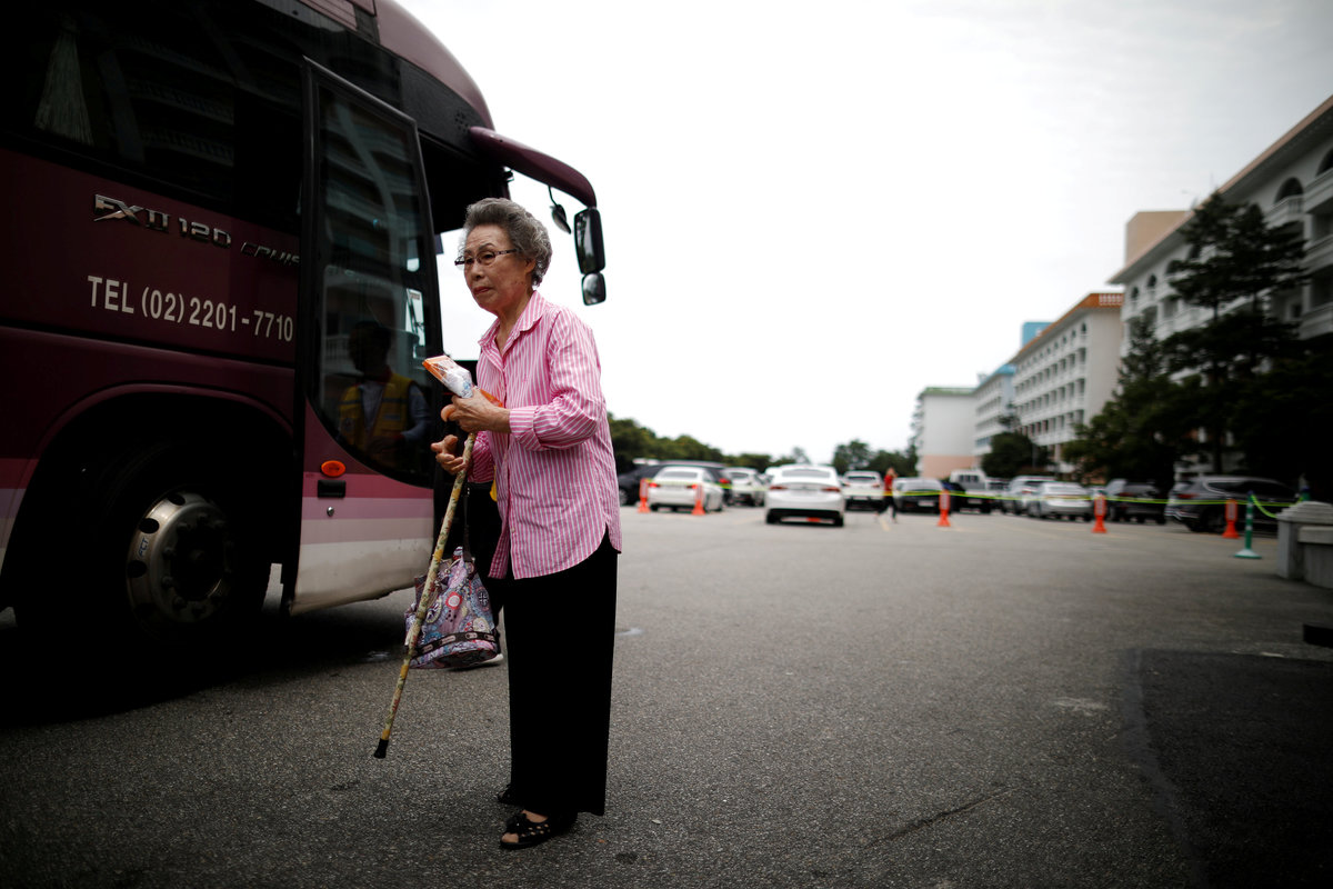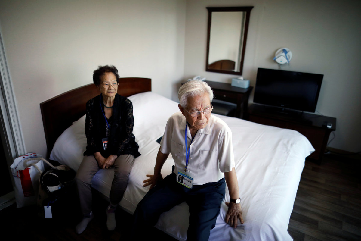 Lee Geum-seom, who has been selected as a participant for a reunion, is helped by volunteers as she arrives at a hotel used as a waiting place in Sokcho, South Korea, August 19, 2018. REUTERS/Kim Hong-JiLee Geum-seom, who has been selected as a participant for a reunion, speaks to the media as she arrives at a hotel used as a waiting place in Sokcho, South Korea, August 19, 2018. REUTERS/Kim Hong-JiKim Hyun-sook poses for photographs after an interview with Reuters at her home in Seoul, South Korea, August 2, 2018. Picture taken August 2, 2018. REUTERS/Kim Hong-JiPhotos taken while Kim Hyun-sook attended last family reunions are seen during her interview with Reuters at her home in Seoul, South Korea, August 2, 2018. Picture taken August 2, 2018. REUTERS/Kim Hong-JiKim Hyun-sook poses for photographs with an old photo showing her daughters, during an interview with Reuters at her home in Seoul, South Korea, August 2, 2018. Picture taken August 2, 2018. REUTERS/Kim Hong-JiKim Hyun-sook speaks during an interview with Reuters at her home in Seoul, South Korea, August 2, 2018. Picture taken August 2, 2018. REUTERS/Kim Hong-JiBae Soon-hui sheds a tear during an interview with Reuters at her home in Seoul, South Korea, August 9, 2018. Picture taken August 9, 2018. REUTERS/Kim Hong-JiHwang Rae-ha poses for photographs in front of a pair of binoculars in Ganghwa, South Korea, July 25, 2018. Picture taken July 25, 2018. REUTERS/Lim Sang-gyuA woman who are selected as a participant for a reunion arrives at a hotel used as a waiting place in Sokcho, South Korea, August 19, 2018. REUTERS/Kim Hong-JiKim Hyun-sook poses for photographs with an old photo showing her daughters, during an interview with Reuters at her home in Seoul, South Korea. REUTERS/Kim Hong-JiA man who has been selected as a participant for a reunion is wheeled as he arrives at a hotel used as a waiting place in Sokcho, South Korea, August 19, 2018. REUTERS/Kim Hong-JiMoon Hyun-sook who has been selected as a participant for a reunion rests at a hotel used as a waiting place in Sokcho, South Korea, August 19, 2018. REUTERS/Kim Hong-Ji Moon Hyun-sook (R) who has been selected as a participant for a reunion rests at a hotel used as a waiting place in Sokcho, South Korea, August 19, 2018. REUTERS/Kim Hong-JiA man who has been selected as a participant for a reunion holds an old picture at a hotel used as a waiting place in Sokcho, South Korea, August 19, 2018. REUTERS/Kim Hong-JiPark Kab-il and Baek Seong-yeon who have been selected as participants for a reunion rest at a hotel used as a waiting place in Sokcho, South Korea, August 19, 2018. REUTERS/Kim Hong-JiA man who has been selected as a participant for a reunion reacts as he arrives at a hotel used as a waiting place in Sokcho, South Korea, August 19, 2018. REUTERS/Kim Hong-Ji A man who has been selected as a participant for a reunion rests at a hotel used as a waiting place in Sokcho, South Korea, August 19, 2018. REUTERS/Kim Hong-JiA man who has been selected as a participant for a reunion arrives at a hotel used as a waiting place in Sokcho, South Korea, August 19, 2018. REUTERS/Kim Hong-JiA woman who has been selected as a participant for a reunion takes a selfie with her family members at a hotel used as a waiting place in Sokcho, South Korea, August 19, 2018. REUTERS/Kim Hong-JiA man who has been selected as a participant for a reunion arrives at a hotel used as a waiting place in Sokcho, South Korea, August 19, 2018. REUTERS/Kim Hong-JiA man who has been selected as a participant for a reunion reacts as he arrives at a hotel used as a waiting place in Sokcho, South Korea, August 19, 2018. REUTERS/Kim Hong-JiA man who has been selected as a participant for a reunion poses for a group photo with his family members at a hotel used as a waiting place in Sokcho, South Korea, August 19, 2018. REUTERS/Kim Hong-JiA woman selected as a participant for a reunion rests at a hotel used as a waiting place in Sokcho, South Korea, August 19, 2018. REUTERS/Kim Hong-JiSouth Korean participants for a reunion arrive at the South's CIQ (Customs, Immigration and Quarantine), just south of the DMZ in Goseong, South Korea, August 20, 2018. REUTERS/Kim Hong-JiBuses transporting South Korean participants for a reunion travel on the road leading to North Korea's Mount Kumgang resort, in the demilitarized zone (DMZ) separating the two Koreas, in this picture taken from the Unification Observatory, just south of the DMZ in Goseong, South Korea, August 20, 2018. REUTERS/Kim Hong-JiBuses transporting South Korean participants for a reunion travel on the road leading to North Korea's Mount Kumgang resort, in the demilitarized zone (DMZ) separating the two Koreas, in this picture taken from the Unification Observatory, just south of the DMZ in Goseong, South Korea, August 20, 2018. REUTERS/Kim Hong-JiBuses transporting South Korean participants for a reunion travel on the road leading to North Korea's Mount Kumgang resort, in the demilitarized zone (DMZ) separating the two Koreas, in this picture taken from the Unification Observatory, just south of the DMZ in Goseong, South Korea, August 20, 2018. REUTERS/Kim Hong-JiA South Korean soldier stands guard at the Unification Observatory, just south of the demilitarized zone separating the two Koreas in Goseong, South Korea, August 20, 2018. REUTERS/Kim Hong-JiA man looks toward the north through field glasses as a family poses for a photograph, at the Unification Observatory just south of the demilitarized zone separating the two Koreas in Goseong, South Korea, August 20, 2018. REUTERS/Kim Hong-JiA woman looks toward the north through a field glasses from the Unification Observatory, just south of the demilitarized zone separating the two Koreas in Goseong, South Korea, August 20, 2018. REUTERS/Kim Hong-JiA woman in traditional costume Hanbok takes photographs of North Korean territory from the Unification Observatory, just south of the demilitarized zone s
