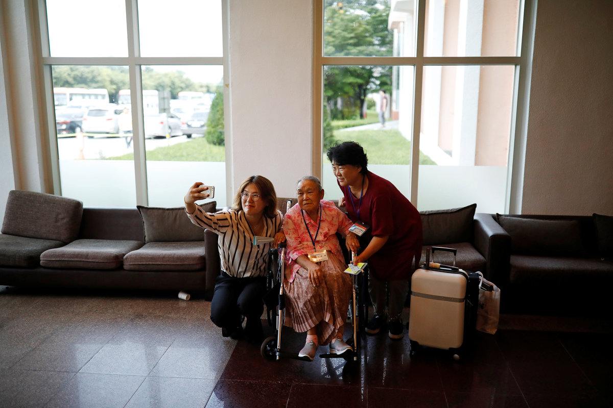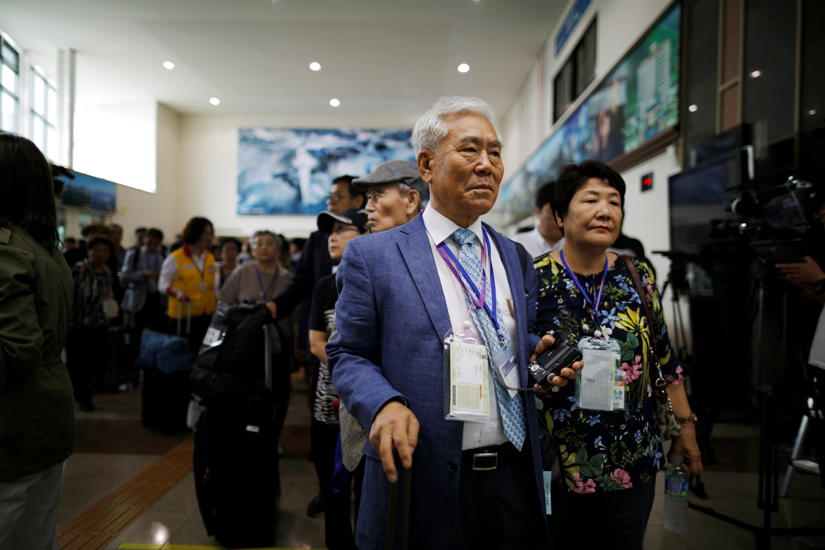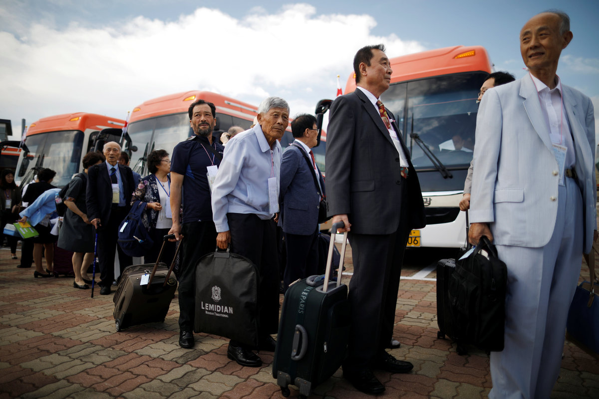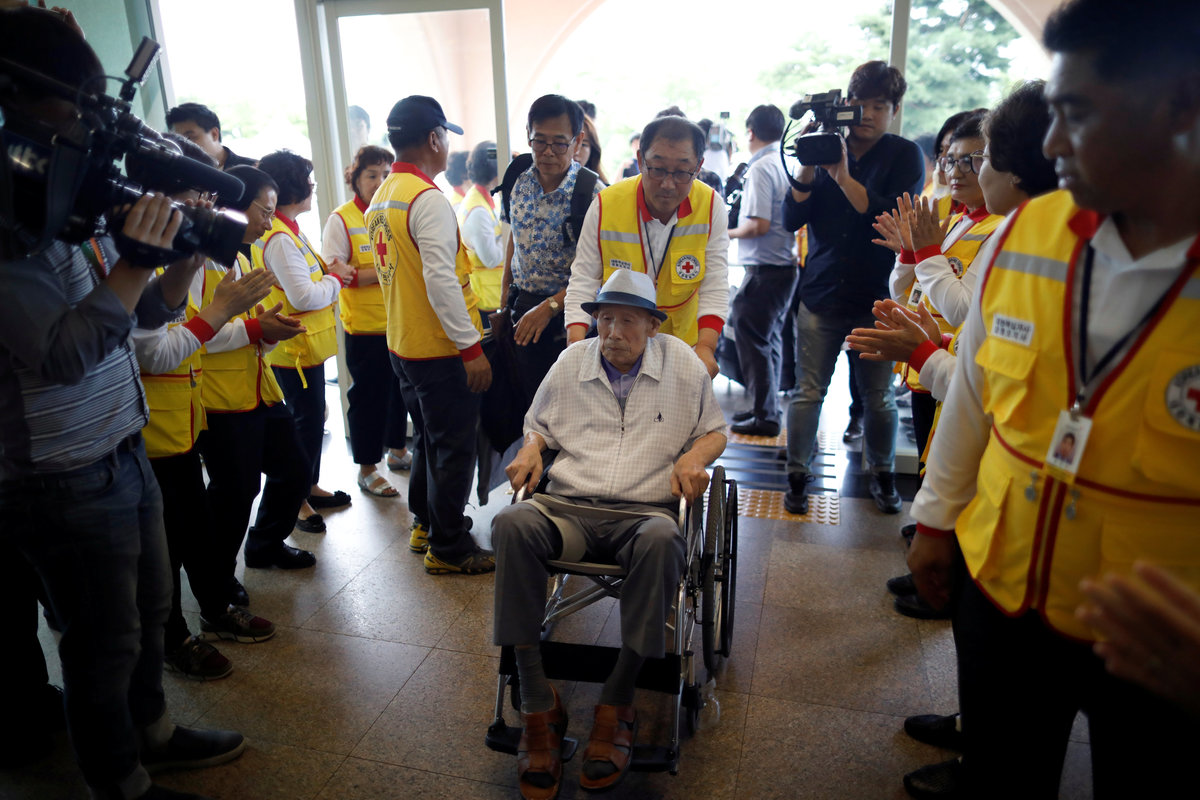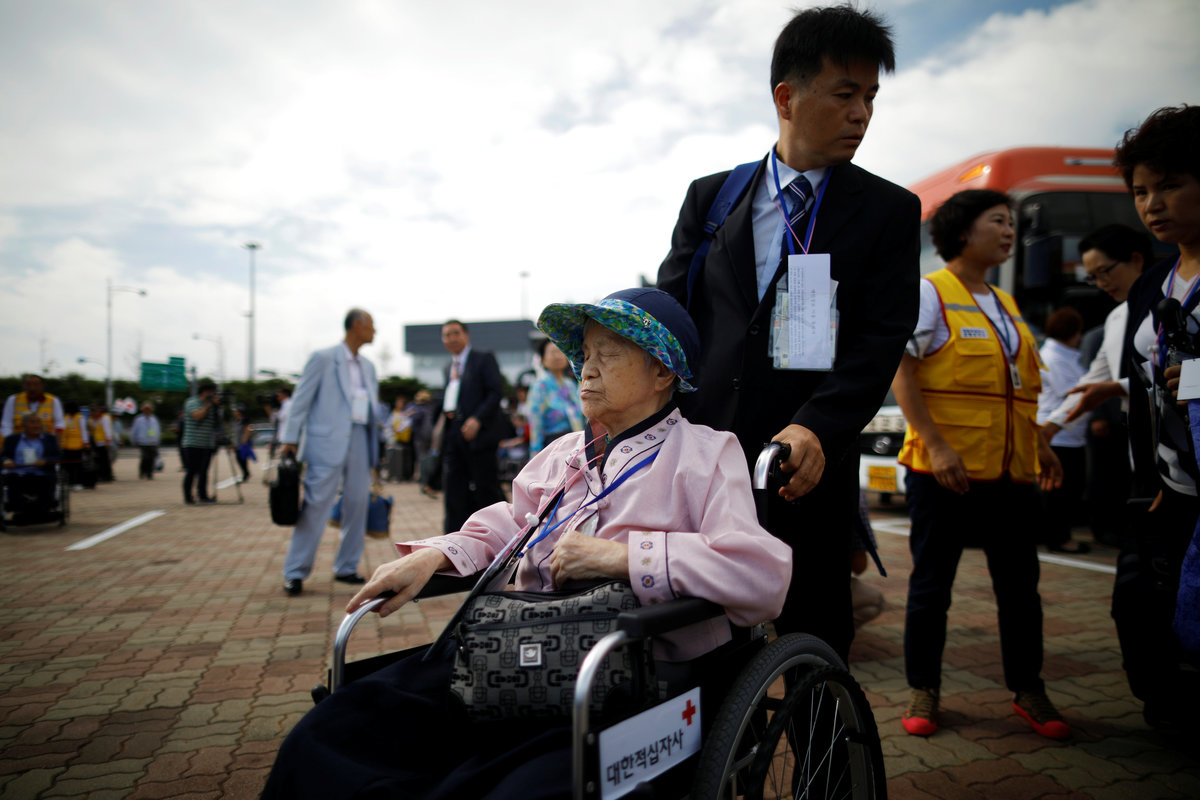 Lee Geum-seom, who has been selected as a participant for a reunion, is helped by volunteers as she arrives at a hotel used as a waiting place in Sokcho, South Korea, August 19, 2018. REUTERS/Kim Hong-JiLee Geum-seom, who has been selected as a participant for a reunion, speaks to the media as she arrives at a hotel used as a waiting place in Sokcho, South Korea, August 19, 2018. REUTERS/Kim Hong-JiKim Hyun-sook poses for photographs after an interview with Reuters at her home in Seoul, South Korea, August 2, 2018. Picture taken August 2, 2018. REUTERS/Kim Hong-JiPhotos taken while Kim Hyun-sook attended last family reunions are seen during her interview with Reuters at her home in Seoul, South Korea, August 2, 2018. Picture taken August 2, 2018. REUTERS/Kim Hong-JiKim Hyun-sook poses for photographs with an old photo showing her daughters, during an interview with Reuters at her home in Seoul, South Korea, August 2, 2018. Picture taken August 2, 2018. REUTERS/Kim Hong-JiKim Hyun-sook speaks during an interview with Reuters at her home in Seoul, South Korea, August 2, 2018. Picture taken August 2, 2018. REUTERS/Kim Hong-JiBae Soon-hui sheds a tear during an interview with Reuters at her home in Seoul, South Korea, August 9, 2018. Picture taken August 9, 2018. REUTERS/Kim Hong-JiHwang Rae-ha poses for photographs in front of a pair of binoculars in Ganghwa, South Korea, July 25, 2018. Picture taken July 25, 2018. REUTERS/Lim Sang-gyuA woman who are selected as a participant for a reunion arrives at a hotel used as a waiting place in Sokcho, South Korea, August 19, 2018. REUTERS/Kim Hong-JiKim Hyun-sook poses for photographs with an old photo showing her daughters, during an interview with Reuters at her home in Seoul, South Korea. REUTERS/Kim Hong-JiA man who has been selected as a participant for a reunion is wheeled as he arrives at a hotel used as a waiting place in Sokcho, South Korea, August 19, 2018. REUTERS/Kim Hong-JiMoon Hyun-sook who has been selected as a participant for a reunion rests at a hotel used as a waiting place in Sokcho, South Korea, August 19, 2018. REUTERS/Kim Hong-Ji Moon Hyun-sook (R) who has been selected as a participant for a reunion rests at a hotel used as a waiting place in Sokcho, South Korea, August 19, 2018. REUTERS/Kim Hong-JiA man who has been selected as a participant for a reunion holds an old picture at a hotel used as a waiting place in Sokcho, South Korea, August 19, 2018. REUTERS/Kim Hong-JiPark Kab-il and Baek Seong-yeon who have been selected as participants for a reunion rest at a hotel used as a waiting place in Sokcho, South Korea, August 19, 2018. REUTERS/Kim Hong-JiA man who has been selected as a participant for a reunion reacts as he arrives at a hotel used as a waiting place in Sokcho, South Korea, August 19, 2018. REUTERS/Kim Hong-Ji A man who has been selected as a participant for a reunion rests at a hotel used as a waiting place in Sokcho, South Korea, August 19, 2018. REUTERS/Kim Hong-JiA man who has been selected as a participant for a reunion arrives at a hotel used as a waiting place in Sokcho, South Korea, August 19, 2018. REUTERS/Kim Hong-JiA woman who has been selected as a participant for a reunion takes a selfie with her family members at a hotel used as a waiting place in Sokcho, South Korea, August 19, 2018. REUTERS/Kim Hong-JiA man who has been selected as a participant for a reunion arrives at a hotel used as a waiting place in Sokcho, South Korea, August 19, 2018. REUTERS/Kim Hong-JiA man who has been selected as a participant for a reunion reacts as he arrives at a hotel used as a waiting place in Sokcho, South Korea, August 19, 2018. REUTERS/Kim Hong-JiA man who has been selected as a participant for a reunion poses for a group photo with his family members at a hotel used as a waiting place in Sokcho, South Korea, August 19, 2018. REUTERS/Kim Hong-JiA woman selected as a participant for a reunion rests at a hotel used as a waiting place in Sokcho, South Korea, August 19, 2018. REUTERS/Kim Hong-JiSouth Korean participants for a reunion arrive at the South's CIQ (Customs, Immigration and Quarantine), just south of the DMZ in Goseong, South Korea, August 20, 2018. REUTERS/Kim Hong-JiBuses transporting South Korean participants for a reunion travel on the road leading to North Korea's Mount Kumgang resort, in the demilitarized zone (DMZ) separating the two Koreas, in this picture taken from the Unification Observatory, just south of the DMZ in Goseong, South Korea, August 20, 2018. REUTERS/Kim Hong-JiBuses transporting South Korean participants for a reunion travel on the road leading to North Korea's Mount Kumgang resort, in the demilitarized zone (DMZ) separating the two Koreas, in this picture taken from the Unification Observatory, just south of the DMZ in Goseong, South Korea, August 20, 2018. REUTERS/Kim Hong-JiBuses transporting South Korean participants for a reunion travel on the road leading to North Korea's Mount Kumgang resort, in the demilitarized zone (DMZ) separating the two Koreas, in this picture taken from the Unification Observatory, just south of the DMZ in Goseong, South Korea, August 20, 2018. REUTERS/Kim Hong-JiA South Korean soldier stands guard at the Unification Observatory, just south of the demilitarized zone separating the two Koreas in Goseong, South Korea, August 20, 2018. REUTERS/Kim Hong-JiA man looks toward the north through field glasses as a family poses for a photograph, at the Unification Observatory just south of the demilitarized zone separating the two Koreas in Goseong, South Korea, August 20, 2018. REUTERS/Kim Hong-JiA woman looks toward the north through a field glasses from the Unification Observatory, just south of the demilitarized zone separating the two Koreas in Goseong, South Korea, August 20, 2018. REUTERS/Kim Hong-JiA woman in traditional costume Hanbok takes photographs of North Korean territory from the Unification Observatory, just south of the demilitarized zone s