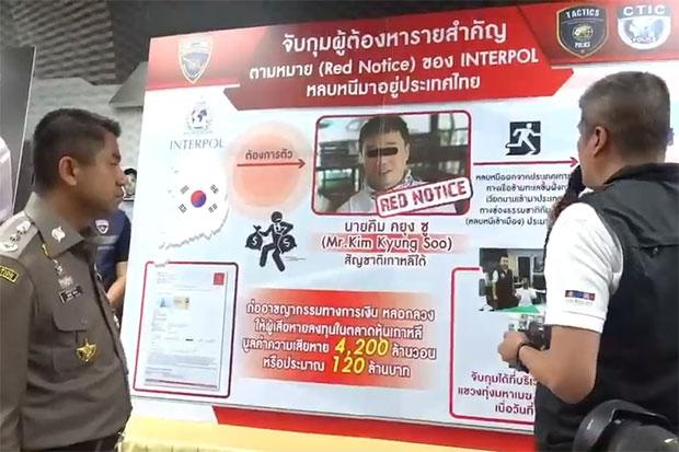 A South Korean man wanted for alleged investment fraud which cost his clients around 4,200 million won (about 120 million baht) has been arrested in Sathon district, Bangkok, on an Interpol red notice.