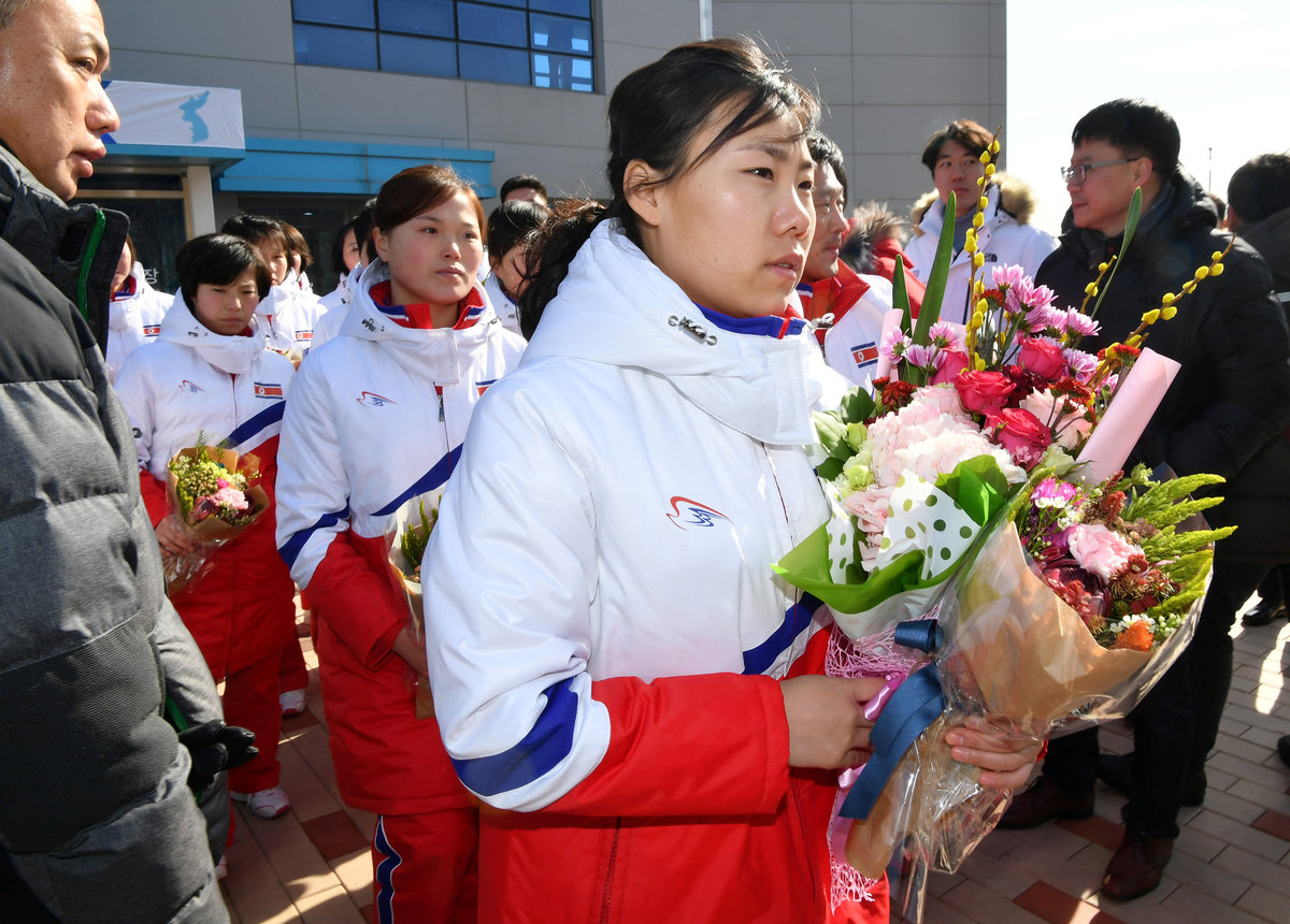 The athletes were met in Jincheon with flowers from their South Korean counterparts, as well as head coach Sarah Murray, who previously had called the government's decision to form a joint team a "tough situation."