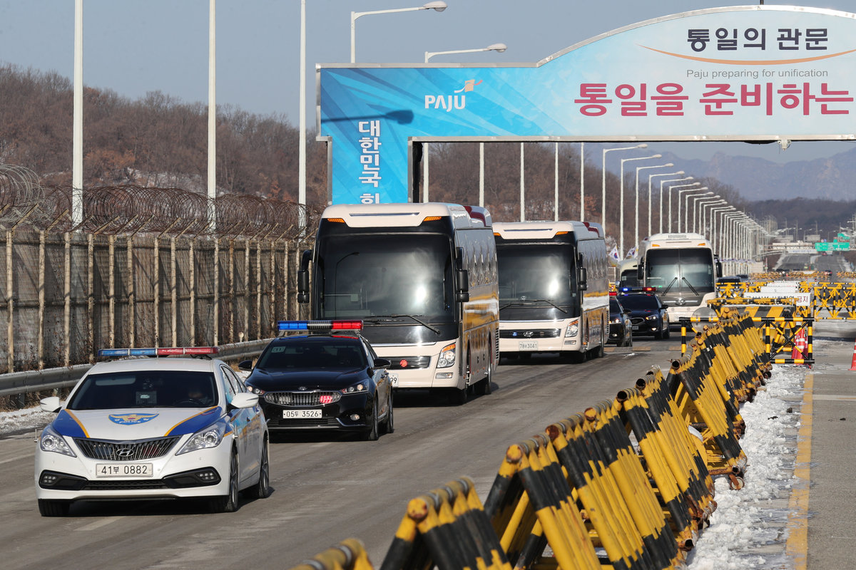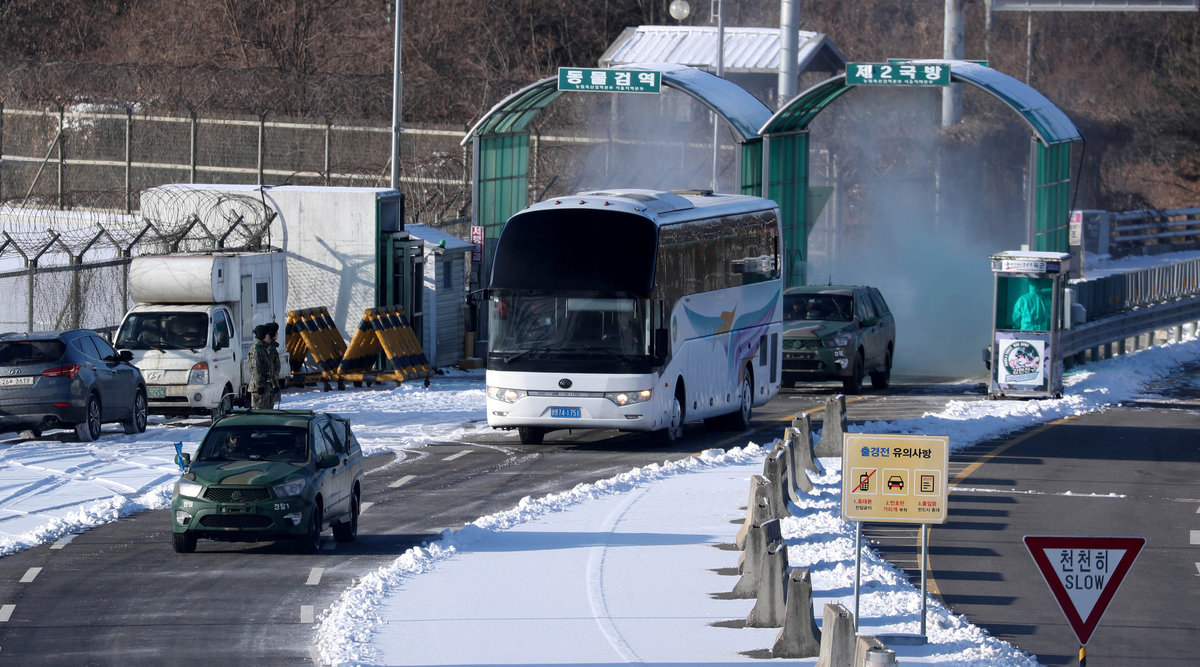 After going through South Korean checkpoints at the border, the team travelled to a national training centre in Jincheon, 90 km (56 miles) south of Seoul.