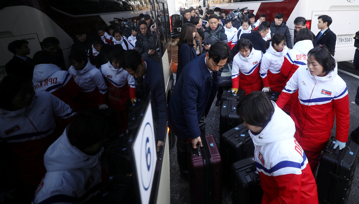 SEOUL (Reuters) - A delegation of North Korean officials and ice hockey players crossed the heavily guarded border into South Korea on Thursday for joint Olympics training, as Pyongyang called for all Koreans to seek unification of the two nations.
