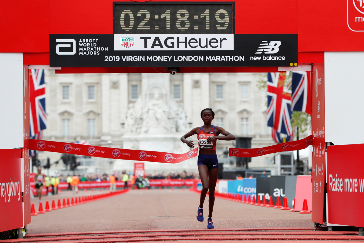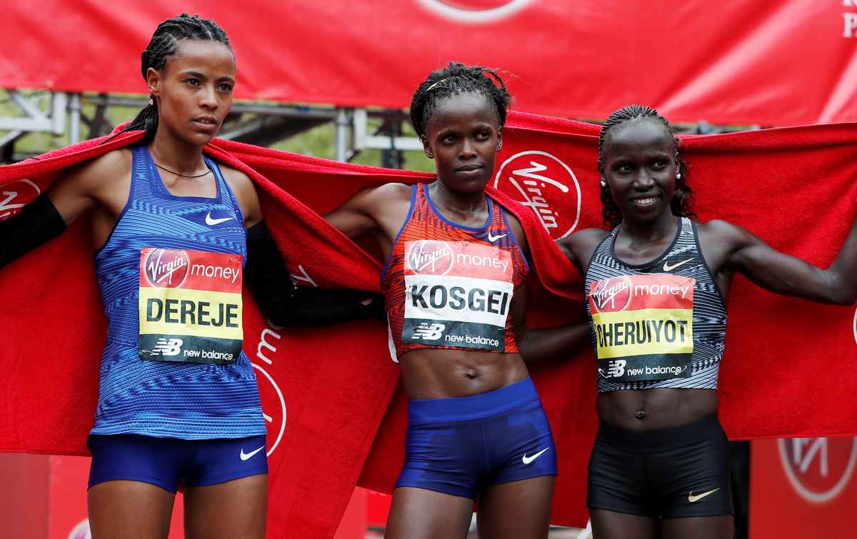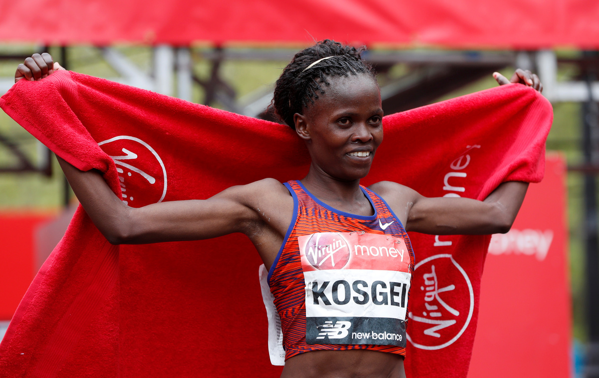 (Reuters) - Kenya's Brigid Kosgei improved on last year's second place to win her first London Marathon title on Sunday, finishing ahead of reigning champion Vivian Cheruiyot, with fellow Kenyan and three-times winner Mary Keitany down in fifth.