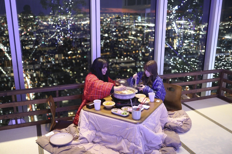 Two women happily share an oden hot-pot as they keep cozy sitting at a kotatsu heated table on the observation deck on the 58th floor of the Abeno Harukasu building in Osaka earlier this month. The special campaign combining two of Japan's favorite things in winter -- oden and kotatsu -- started on Nov. 12 at the tallest building in Japan and will continue through March 27 next year. The price is 2,980 yen per person (minimum of two), including the entrance fee to the observation deck. Drinks are separate. Nine kotatsu tables and one table with a loveseat sofa have been set up on the deck overlooking the city at a height of 280 meters. As a pandemic measure, only two people are allowed per table in principal, although an exception can be made for an accompanying child. Reservations are required and can only be made online.