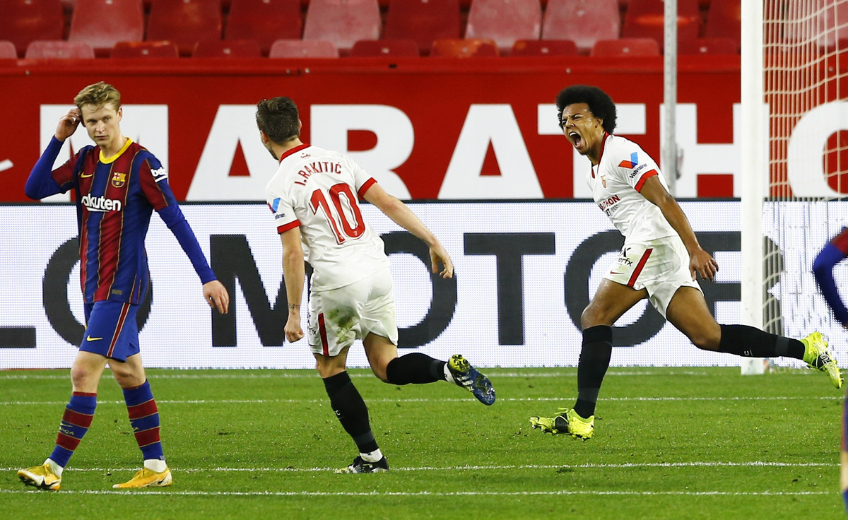 Sevilla defender Jules Kounde scored an extraordinary solo goal and Ivan Rakitic struck against his old side in a 2-0 win over Barcelona in a Copa del Rey semi-final first leg on Wednesday.