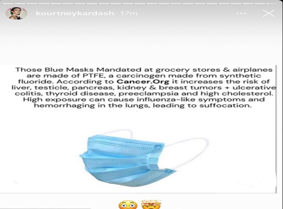 On Saturday, the reality TV star shared a post claiming on her Instagram Story claiming that blue surgical face masks are “made of PTFE, a carcinogen made from synthetic fluoride”.