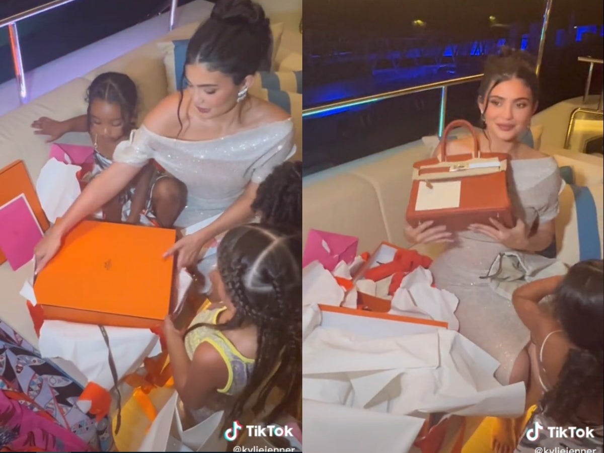 In the video, the Kylie Cosmetics founder opened up two of Hermes’ signature bright orange boxes while all her guests watched.