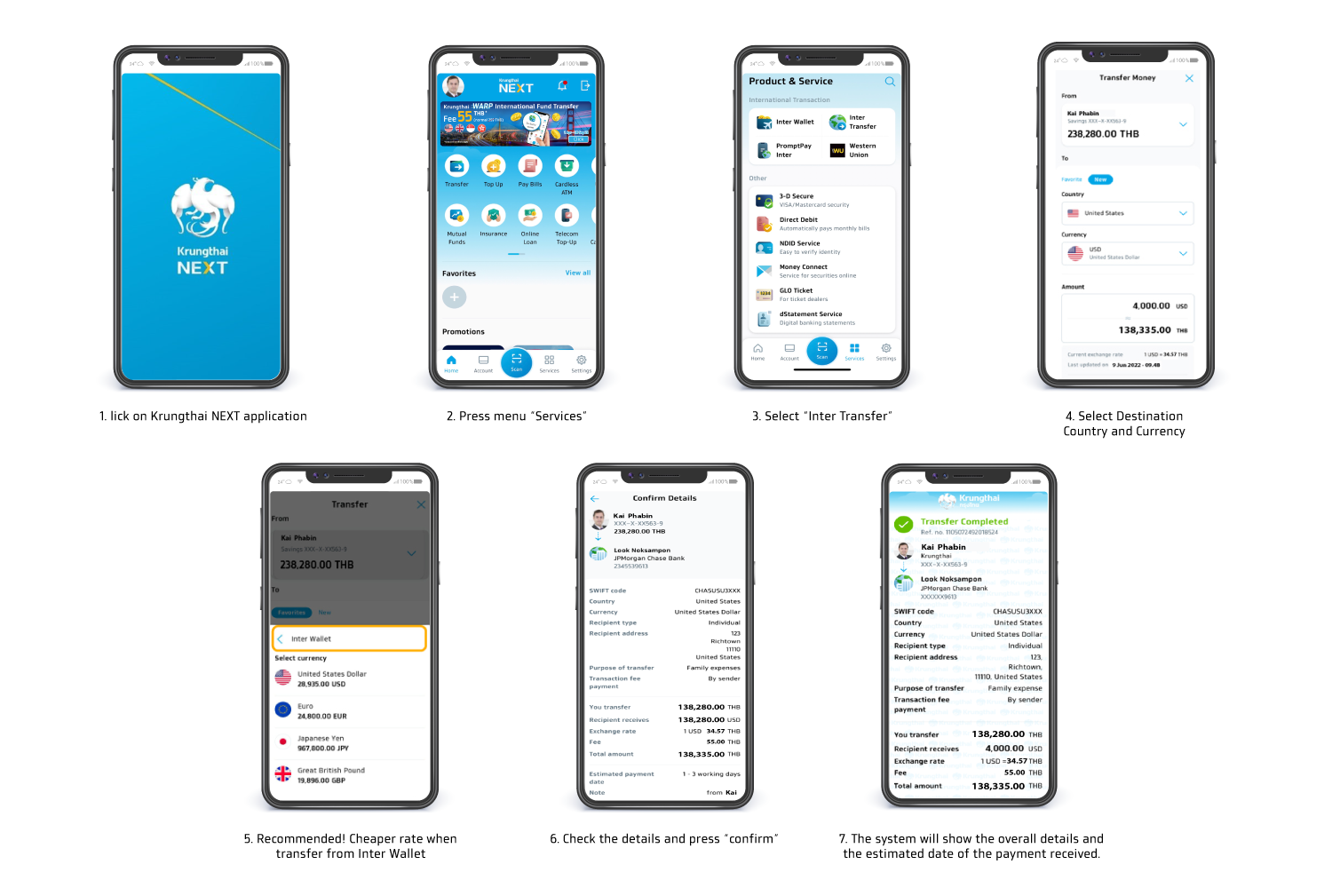 Download “Krungthai NEXT” app now and click “Service” then “International Transfer” and follow simple steps to make your transfer with worry-free and real time service.