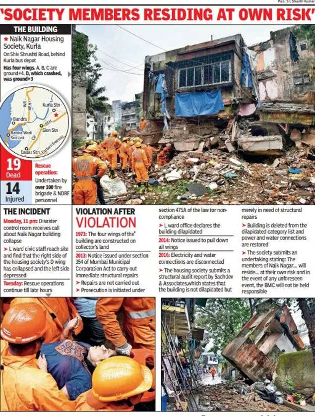 "Another monsoon, another building collapse. The tragic incident once again highlights the government’s failure to provide decent public housing while it continues to encourage luxury housing for the uber-wealthy. For people who cannot afford alternate accommodation in maximum city, it becomes difficult for them to vacate their dilapidated buildings despite notices served by the authorities. Residents prefer to risk their lives because they have no choice. An RTI reply reveals there have been over 800 deaths in building crashes in Mumbai over the past four decades. This is scandalous.-Timesview"