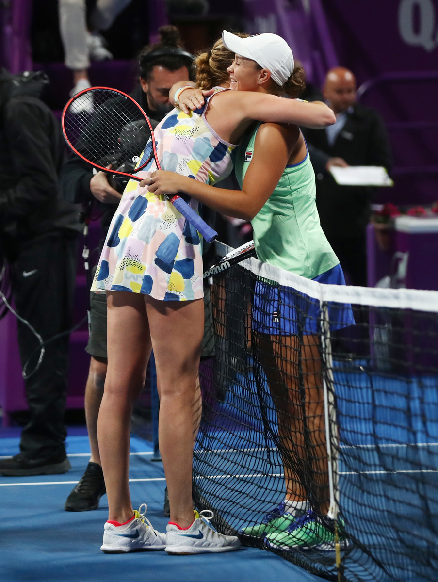 Tennis - WTA Premier 5 - Qatar Open - Khalifa International Tennis and Squash Complex, Doha, Qatar - February 28, 2020 Czech Republic's Petra Kvitova with Australia's Ashleigh Barty after winning their semi final match REUTERS/Ibraheem Al Omari