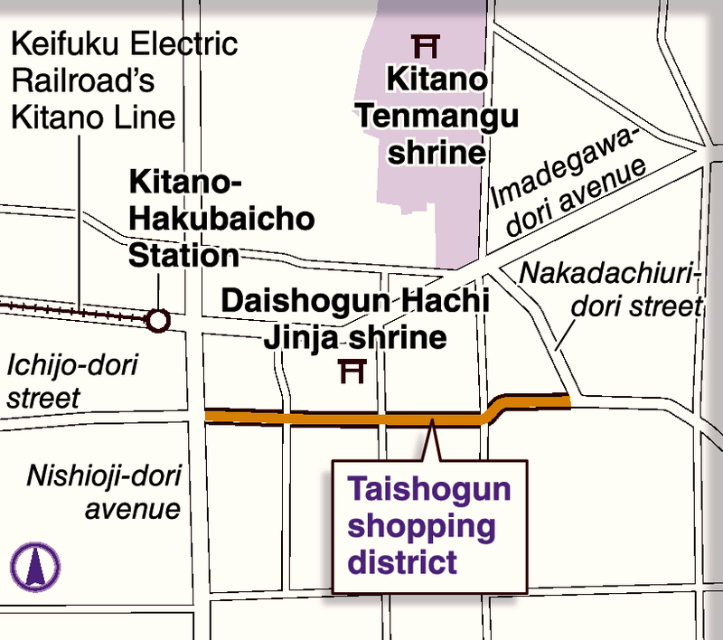 There are about 30 shops in the Taishogun shopping district, which occupies about 500 meters of Ichijo-dori, a street that runs east and west through the ancient capital. Since 2005, local merchants have been promoting the shopping district by dubbing it "Ichijo Yokai Street" in honor of local yokai legends. They realized they had to take some action as an increasing number of shops were closing, mainly due to newly opened supermarkets drawing customers away.