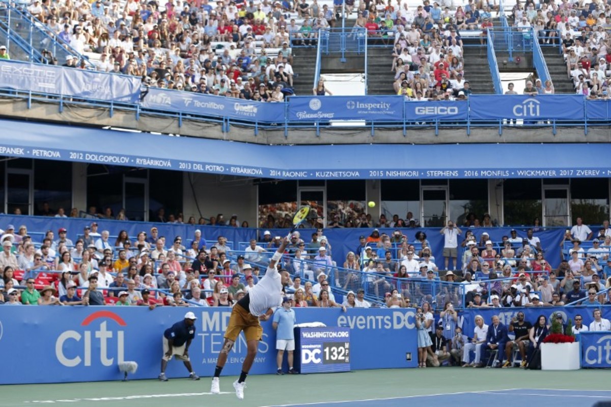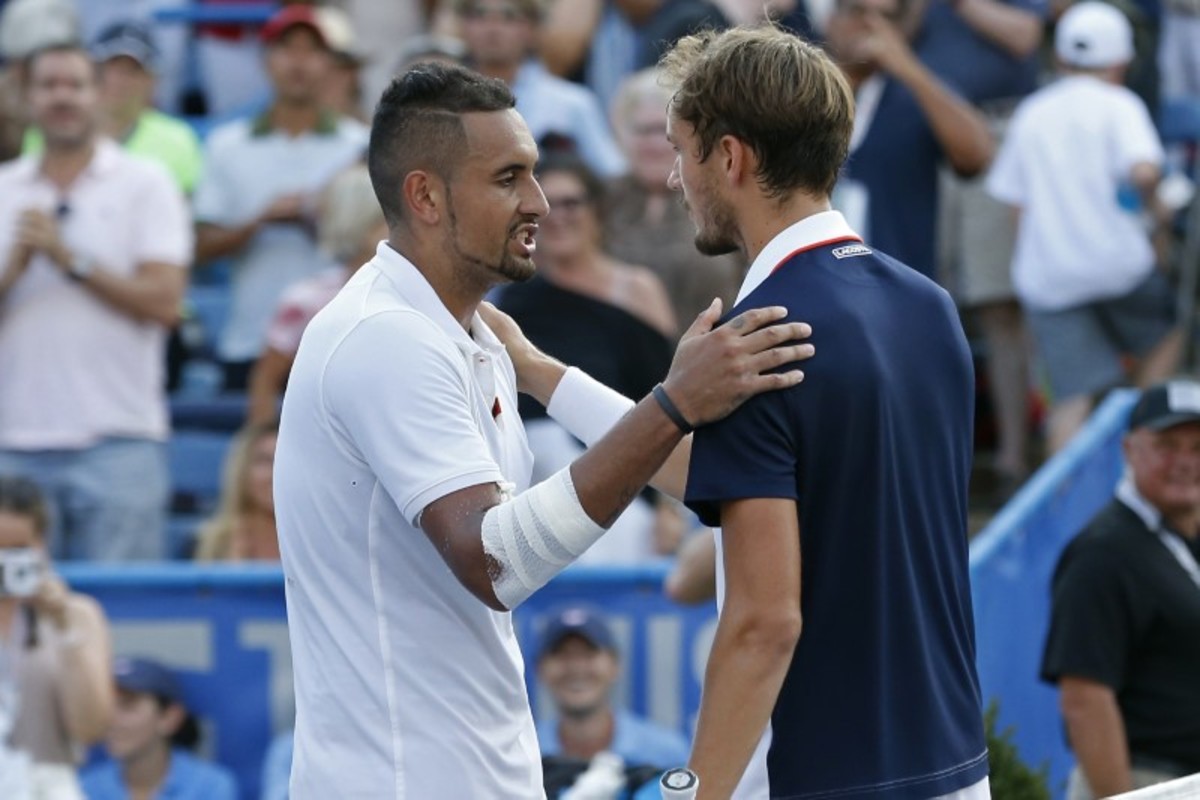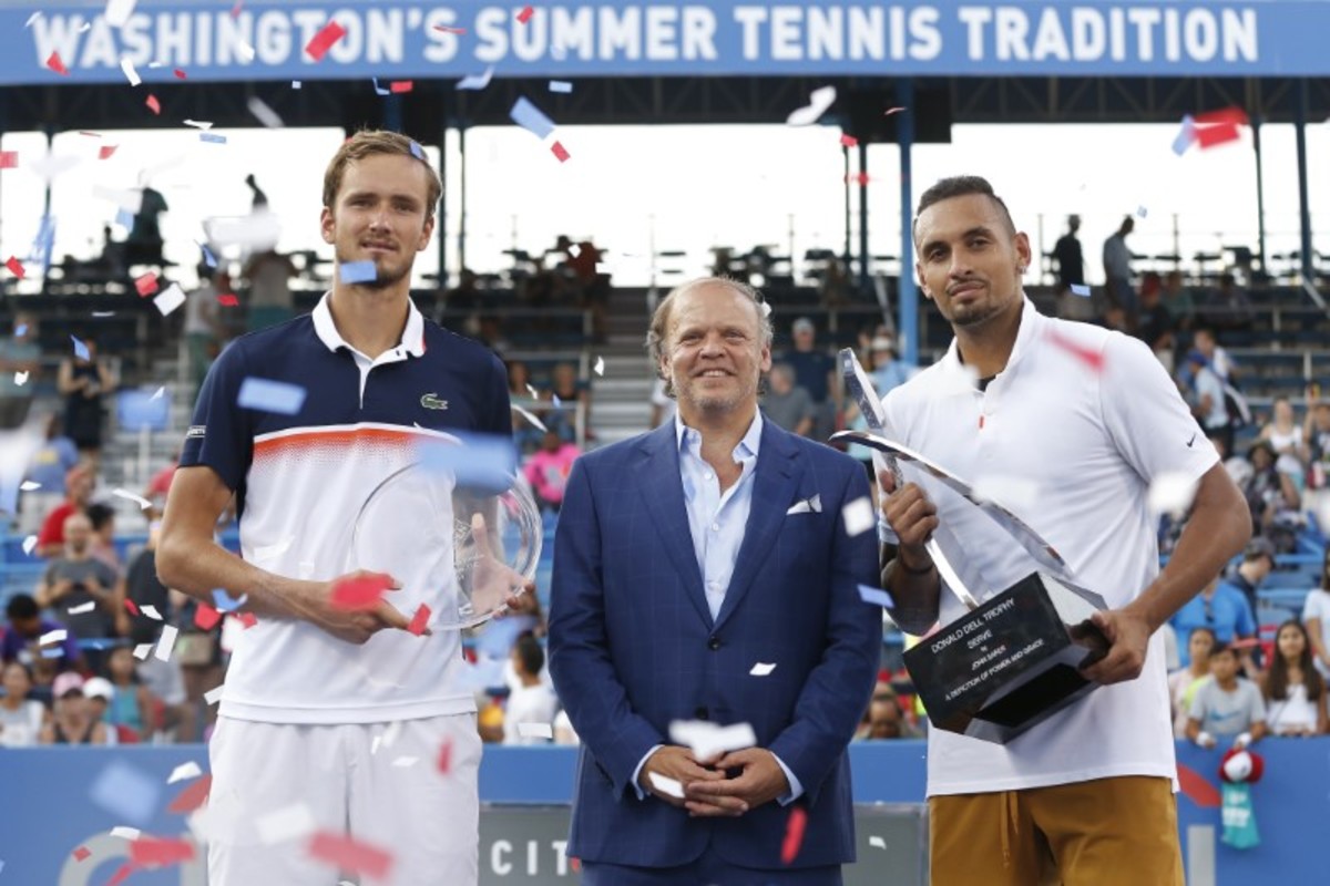 Aug 4, 2019; Washington, D.C., USA; Daniil Medvedev of Russia hits a backhand against Nick Kyrgios of Australia (not pictured) in the menÕs singles final of the 2019 Citi Open at William H.G. FitzGerald Tennis Center. Mandatory Credit: Geoff Burke-USA TODAY SportsAug 4, 2019; Washington, D.C., USA; Nick Kyrgios of Australia hits a backhand against Daniil Medvedev of Russia (not pictured) in the menÕs singles final of the 2019 Citi Open at William H.G. FitzGerald Tennis Center. Mandatory Credit: Geoff Burke-USA TODAY SportsAug 4, 2019; Washington, D.C., USA; Nick Kyrgios of Australia serves on match point against Daniil Medvedev of Russia (not pictured) in the menÕs singles final of the 2019 Citi Open at William H.G. FitzGerald Tennis Center. Mandatory Credit: Geoff Burke-USA TODAY Sports