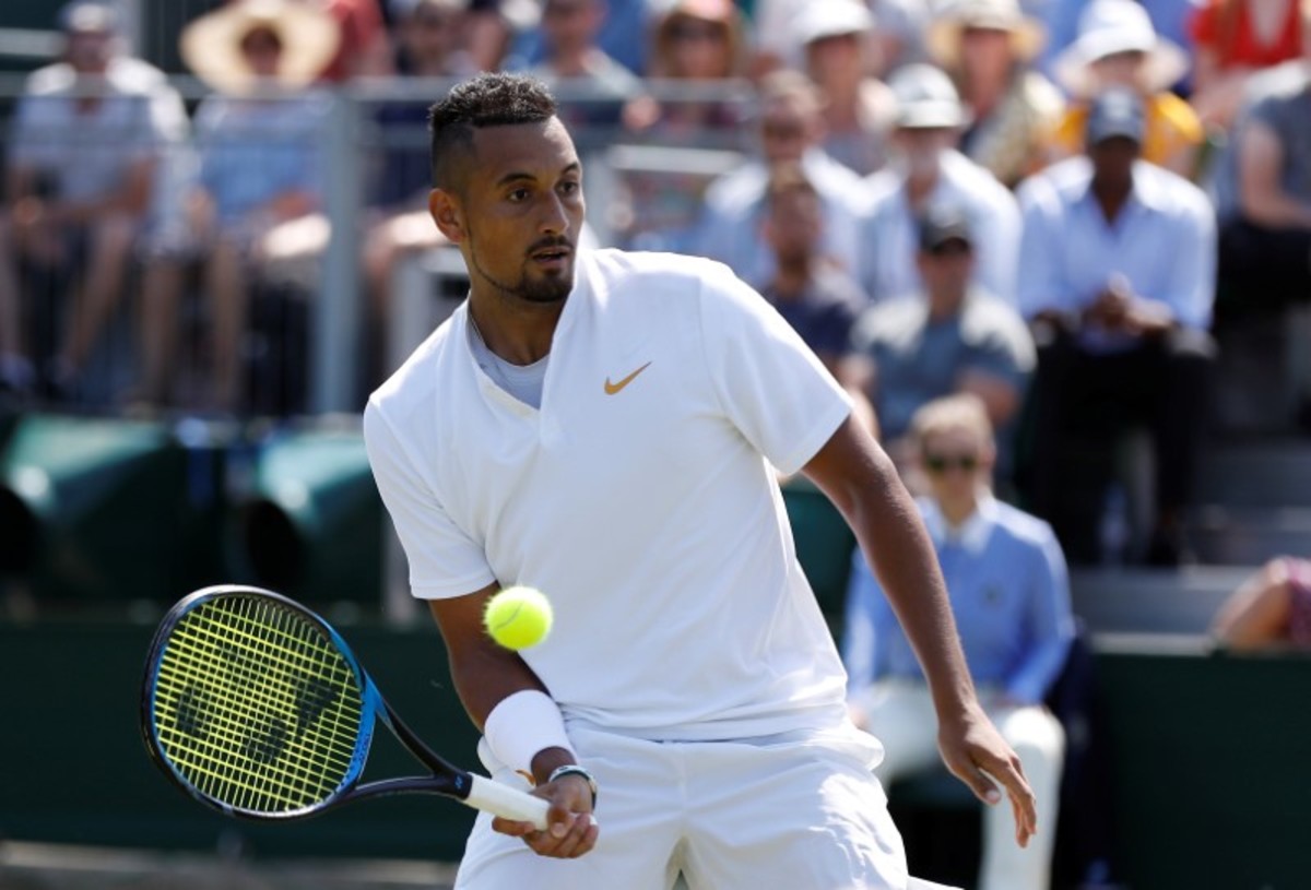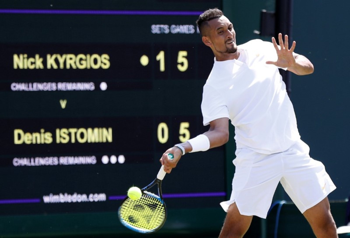 LONDON (Reuters) - Nick Kyrgios was back causing "uproar" at Wimbledon on Tuesday as he cranked down 42 aces in an impressive 7-6(3) 7-6(4) 6-7(5) 6-3 first-round win over Uzbekistan's Denis Istomin on Tuesday.