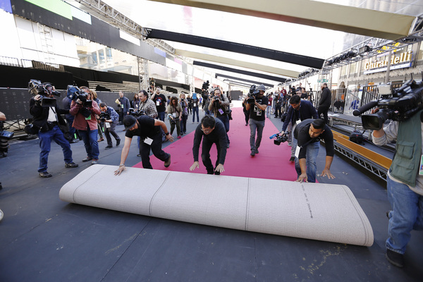 They lugged a roll inside the Dolby's busy forecourt, which is lined with shops including a Louis Vuitton outpost. As workers unrolled the carpet and affixed it to the floor with double-sided tape, shoppers stopped to gawk. A uniformed security guard eyed tourists and shouted "keep off the carpet."