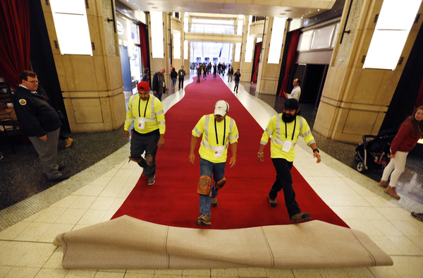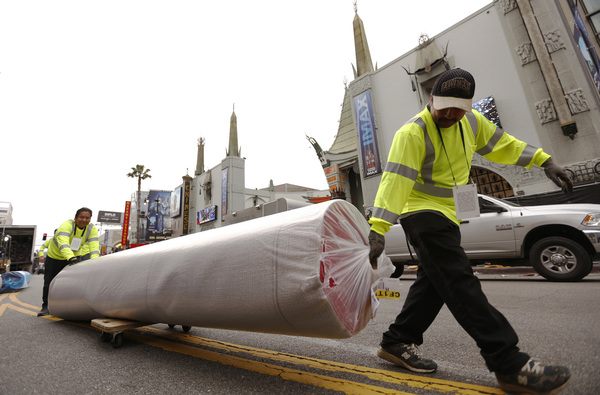 The carpet was trucked to Hollywood on Tuesday afternoon as an off-and-on rainstorm pelted L.A. Upon arrival, a worker with tattooed knuckles used a forklift to pull roughly 30 carpet rolls from the truck, which was parked in a closed section of Hollywood Boulevard in front of Grauman's Chinese Theatre. As he worked under a sky thick with the threat of rain, a few tourists watched the spectacle from behind a chain-link fence.