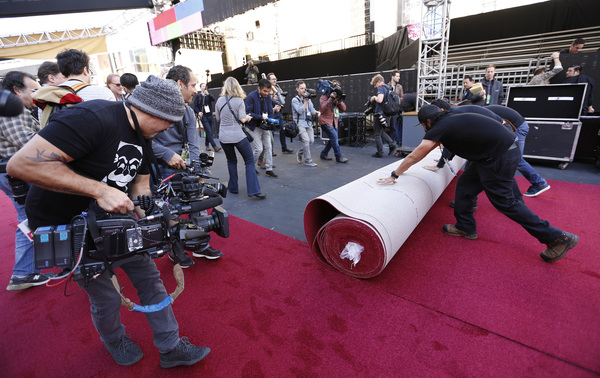 A crew of about 18 workers began installing the red carpet along Hollywood Boulevard in front of the Dolby on Feb. 21. It will take them nearly 900 man-hours to install the carpet, and the work won't be finished until just before the stars begin arriving Sunday afternoon _ as throngs of foreign tourists, street performers in superhero costumes and edgy security guards look on.