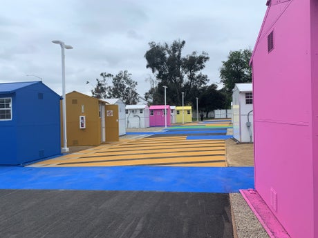Each tiny home in the North Hollywood village has air conditioning, heating and storage space, and residents will be provided with bathrooms, showers and three meals a day.