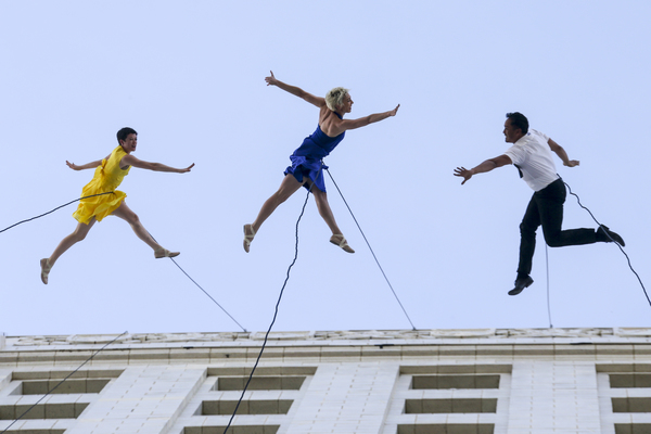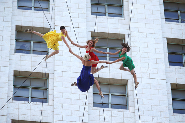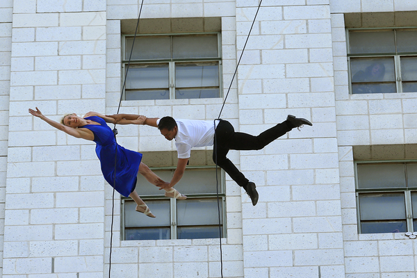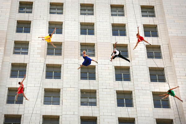 The performance started at 8:30 a.m. and lasted just 10 minutes as the performers danced vertically on the outer walls of City Hall despite strong winds, a drone buzzing around them.