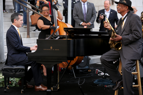 Feeling inspired, Garcetti performed "City of Stars" on the piano, accompanied by the jazz band's bass player and drummer, while the saxophone player snapped his fingers to the beat. Passersby across the street stopped to listen, including 13-year-old Madeleine Schnack and her mother, Shirley Moyers.