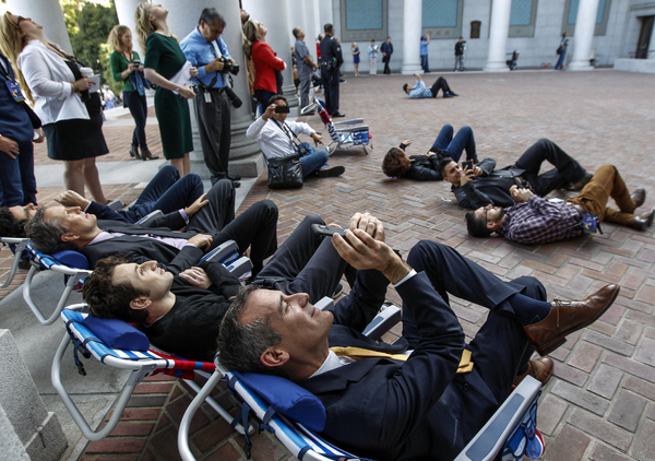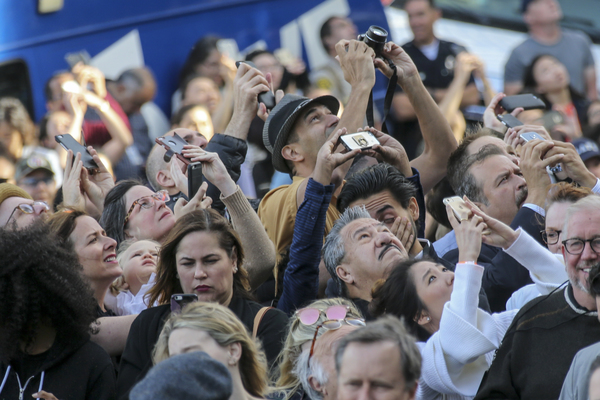 The opening remarks were followed by a performance by the Bandaloop aerial dancers, who performed on the building's facade to the film's score as hundreds of people congregated on the steps of City Hall, necks craned skyward.
