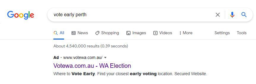 An ad for the website VoteWA.com.au appears as the first or second result under a number of Google searches, including "vote early Perth".